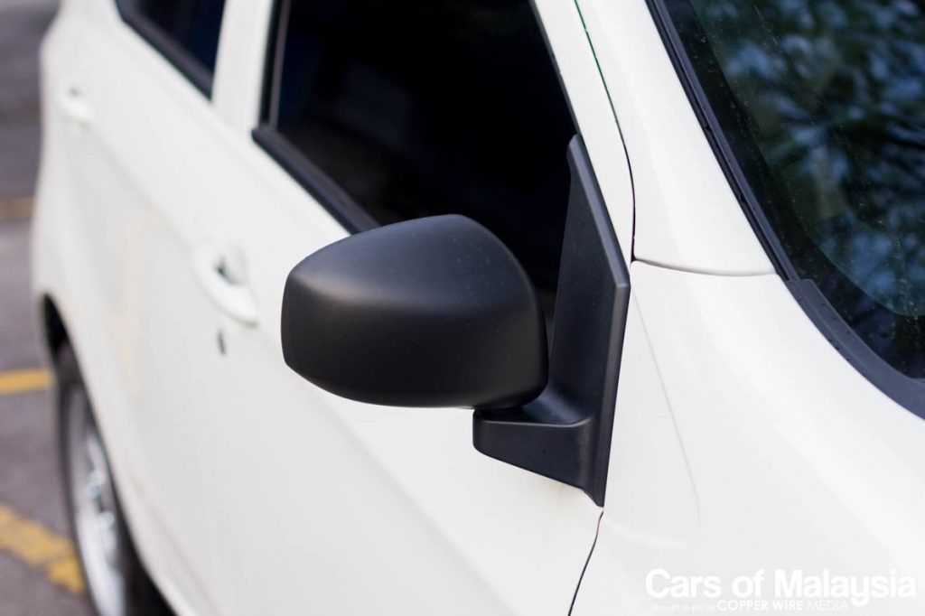 One of the first things you would notice on the outside of the Axia (E) is the lack of a body coloured side mirror. Look even closer and you will realise that it is even more Spartan than a normal manual set of side mirrors. They don’t even have a stalk so you could adjust them from the inside. You have to adjust them manually from the outside.