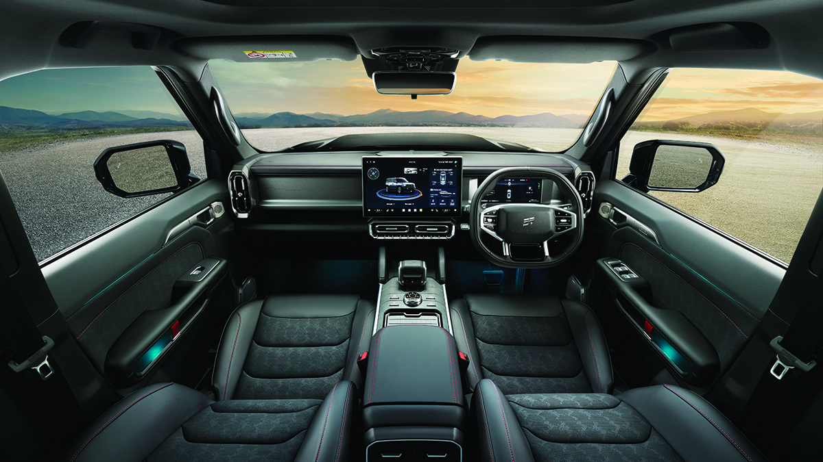 Inside, the Jetour T2 features an interior cabin with plenty of practical grab handles to make getting in and out of the vehicle easier. The dashboard features a straight, rugged design with a floating touchscreen head unit in the middle. The centre air vents and climate control switches are positioned below the display. The front seats are power-adjustable with memory functions and are wrapped in leatherette upholstery with red stitching.