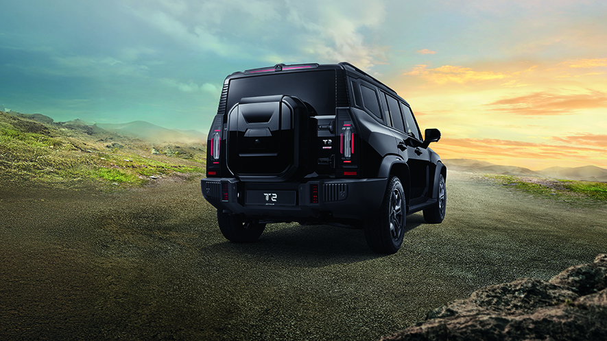 Starting with the dimensions, the Jetour T2 measures 4,785 mm long, 2,006 mm wide, and 1,880 mm tall. Despite its tough off-road appearance, the Jetour T2 uses a unibody construction rather than a body-on-frame chassis. At the front, the Jetour T2 features square headlights with a large grille, complete with bold Jetour lettering. An upright glasshouse further accentuates the boxy design. At the rear, it features a side-opening tailgate and a large storage box that resembles an external spare tyre.