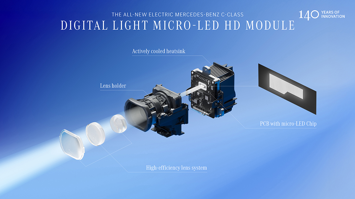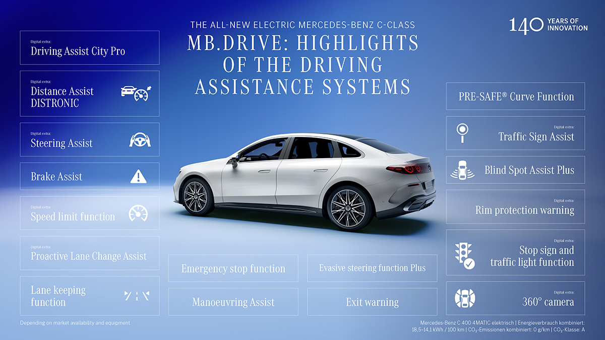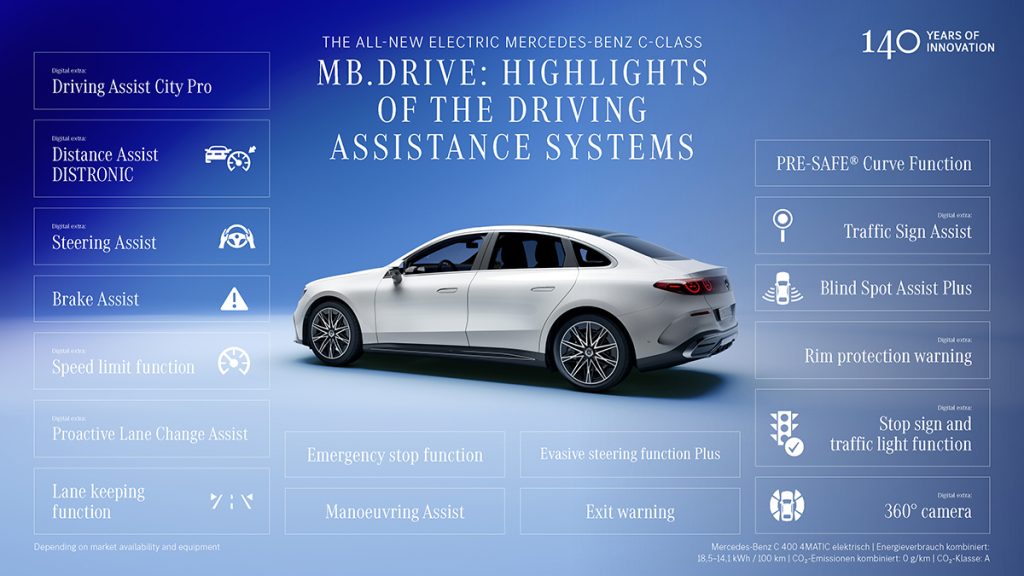 The Mercedes-Benz C-Class electric is equipped with up to 27 cameras and sensors for safety and driver assistance, along with a high-performance water-cooled control unit designed with enough capacity to support future upgrades.